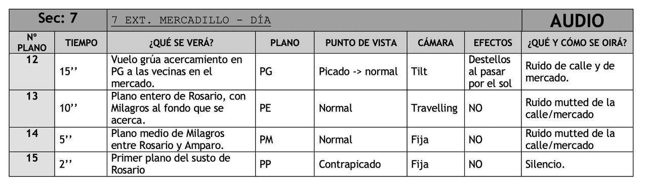 Este es un documento donde se detallan aspectos técnicos del rodaje, también lo separamos en escenas, pero en este caso por cada escena especificamos los movimientos de cámara, los planos, las tomas, las estrategias visuales, la iluminación, el sonido, etc.|   |